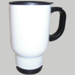 White 14oz Stainless Steel Travel Mug. Not dishwasher safe. Resilient plastic lid, handle, and base